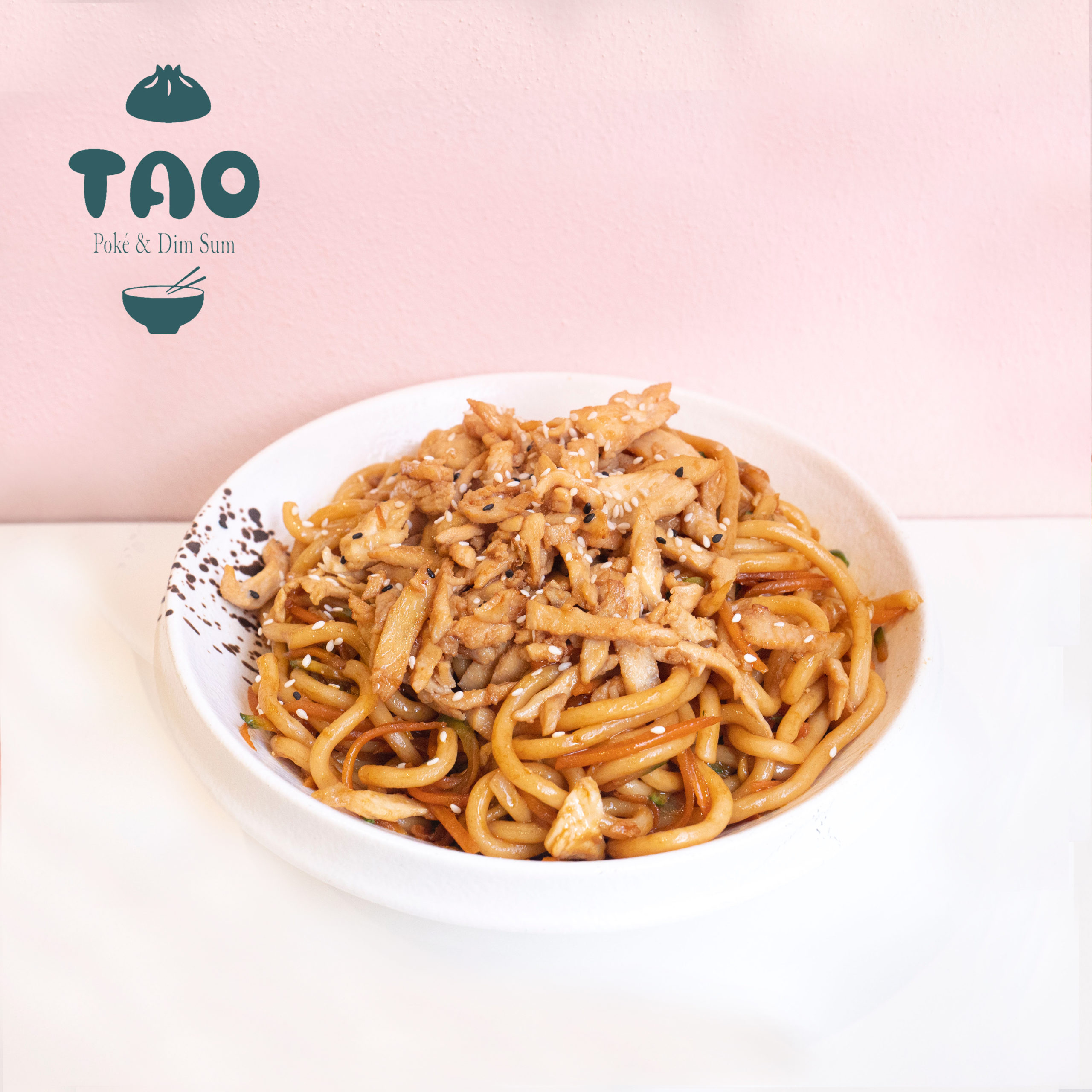 Noodle di riso saltati con pollo, verdure e salsa di soia